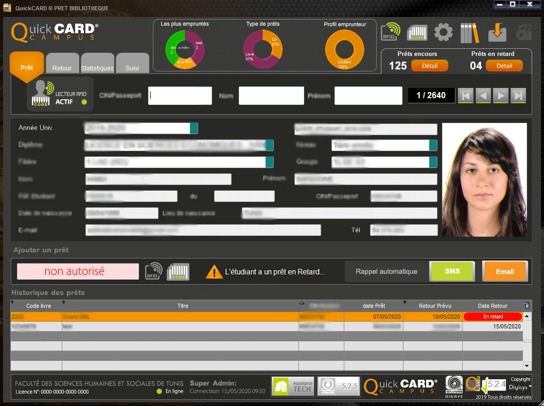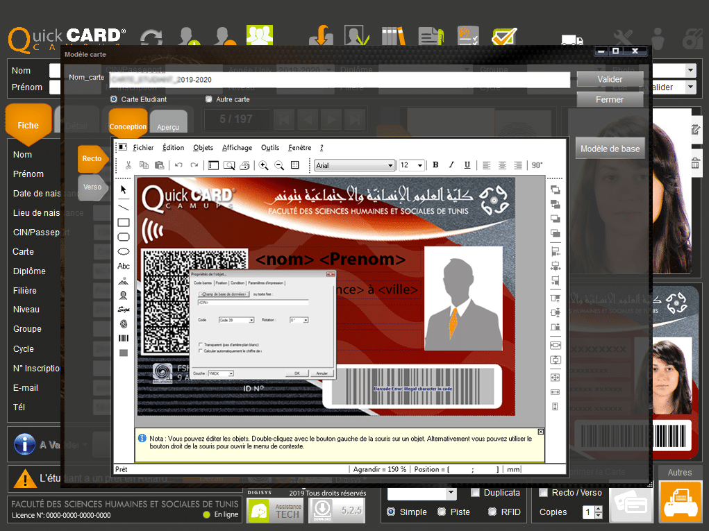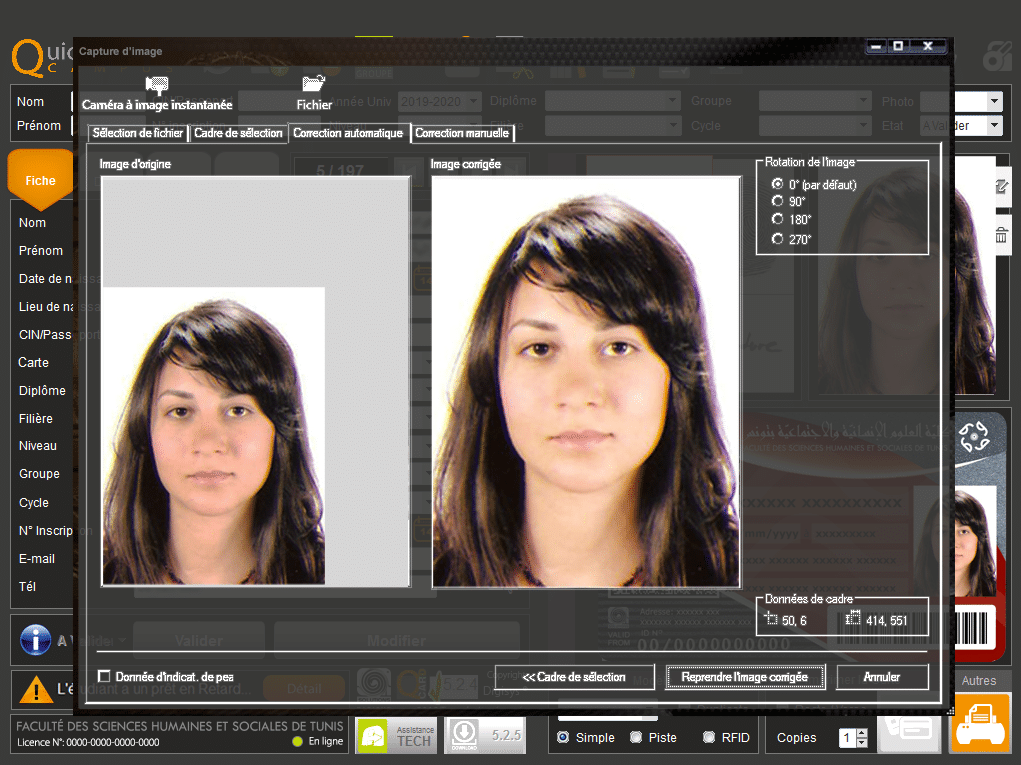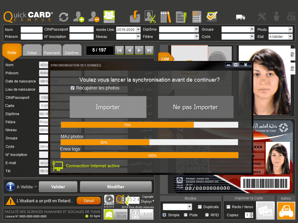 Quickcard ® Campus est connecté directement au site inscription en ligne permettant aux différents établissements universitaires la synchronisation automatique des données des étudiants inscrits dans leurs établissements et d’éditer leur carte d’étudiant en toute sécurité et simplicité.